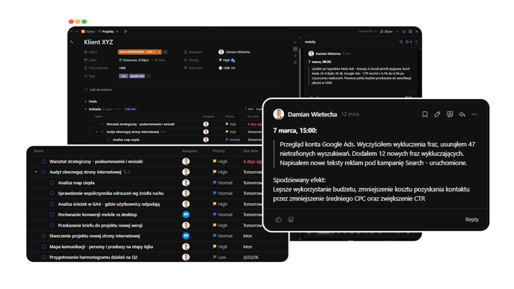 Widzisz każde zadanie, każdą decyzję i każdą minutę pracy w Twoim projekcie. Wiesz dokładnie, za co płacisz i co się dzieje w Twoich kampaniach. Koniec z zastanawianiem się, czy agencja w ogóle coś robi.